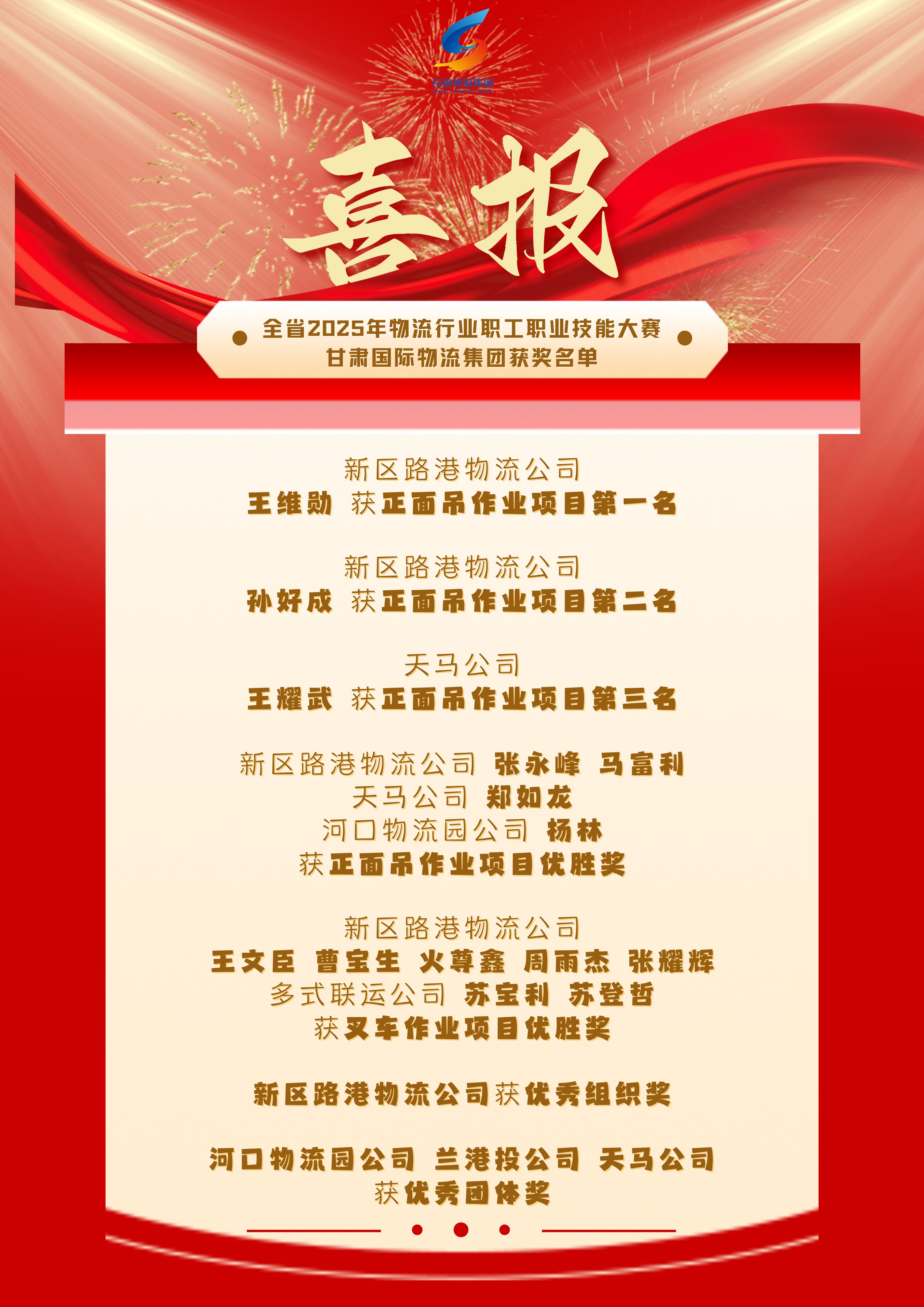 9月29日,甘肅省百萬職工勞動(dòng)和技能競(jìng)賽2025年甘肅省物流行業(yè)職工職業(yè)技能大賽閉幕式在新區(qū)路港物流公司舉行,甘肅國(guó)際物流集團(tuán)各企業(yè)職工積極參加,取得了出色成績(jī)。